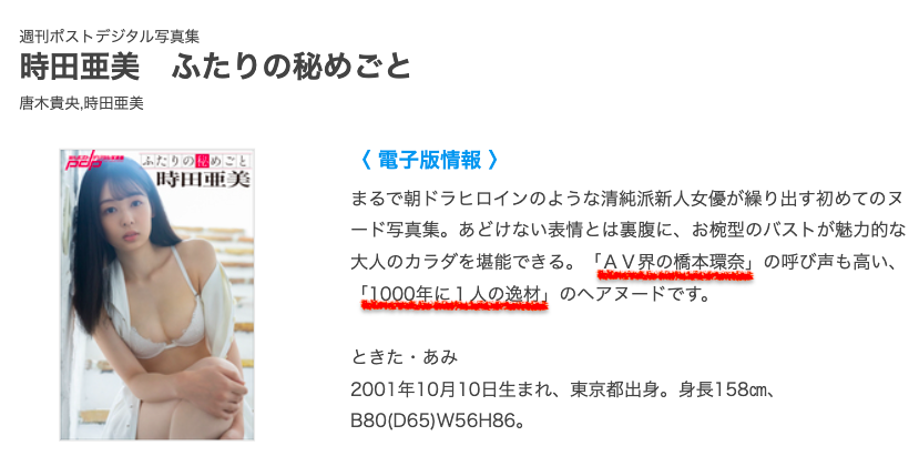 比照最近几位大型新人,时田亜美(时田亚美)是先在杂志「周刊ポスト(周刊Post)」拍摄写真,而且你看人家是怎么宣传这位暗黑界的新人?「
