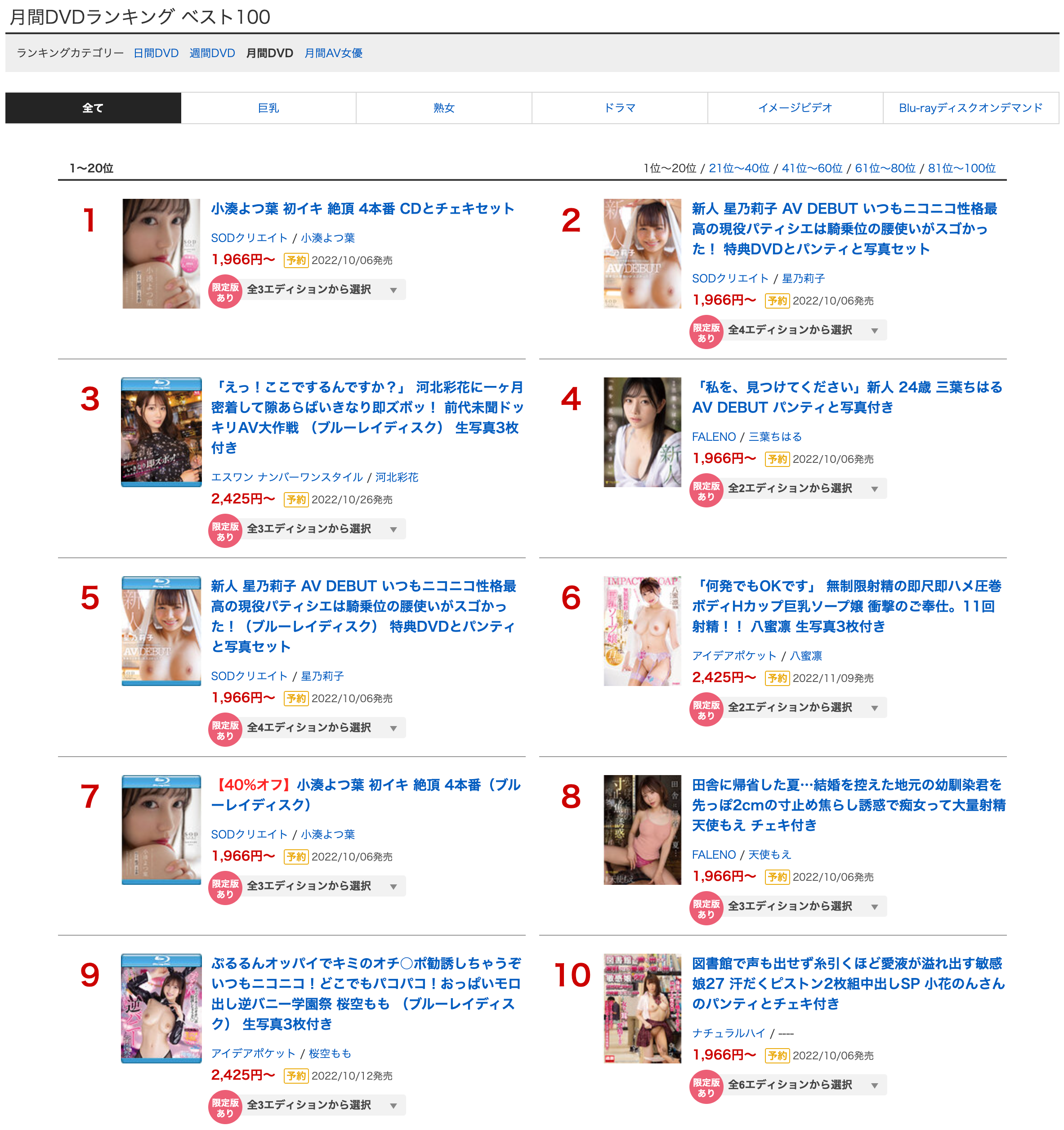 一块儿来看FANZA之前公布的9月销售排行榜,由于串流部分实在太多优惠,所以我们还是来关注实体片的通贩排行榜ー看到这儿可能会有人说了,这不是都「河北彩花」的天下吗?有什么好看的?