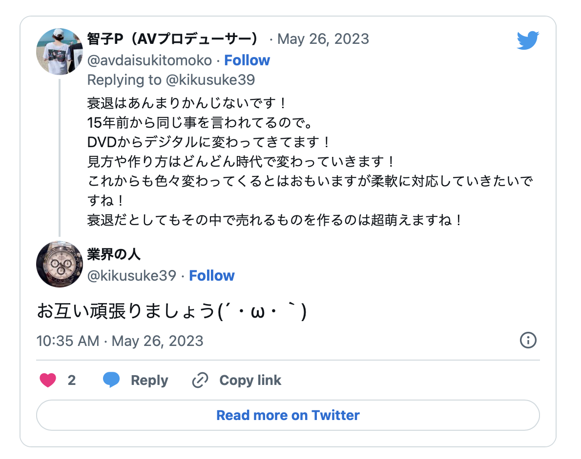 那就是业界有名的制作人「智子P」,在在注意女优twittter的朋友一定看过她,她是这么看「业界の人」这段发言的:「我并没有有感觉到衰退!因为同样的话从15年前就开始说了,从DVD转变为数位的时候,面对时代的改变,想法及做法都要有所因应,今后应该也会有许多变化,要更谨慎地去应对,就算在衰退的时代如果能做出超级卖的片子,那不是让人热血沸腾吗?!」